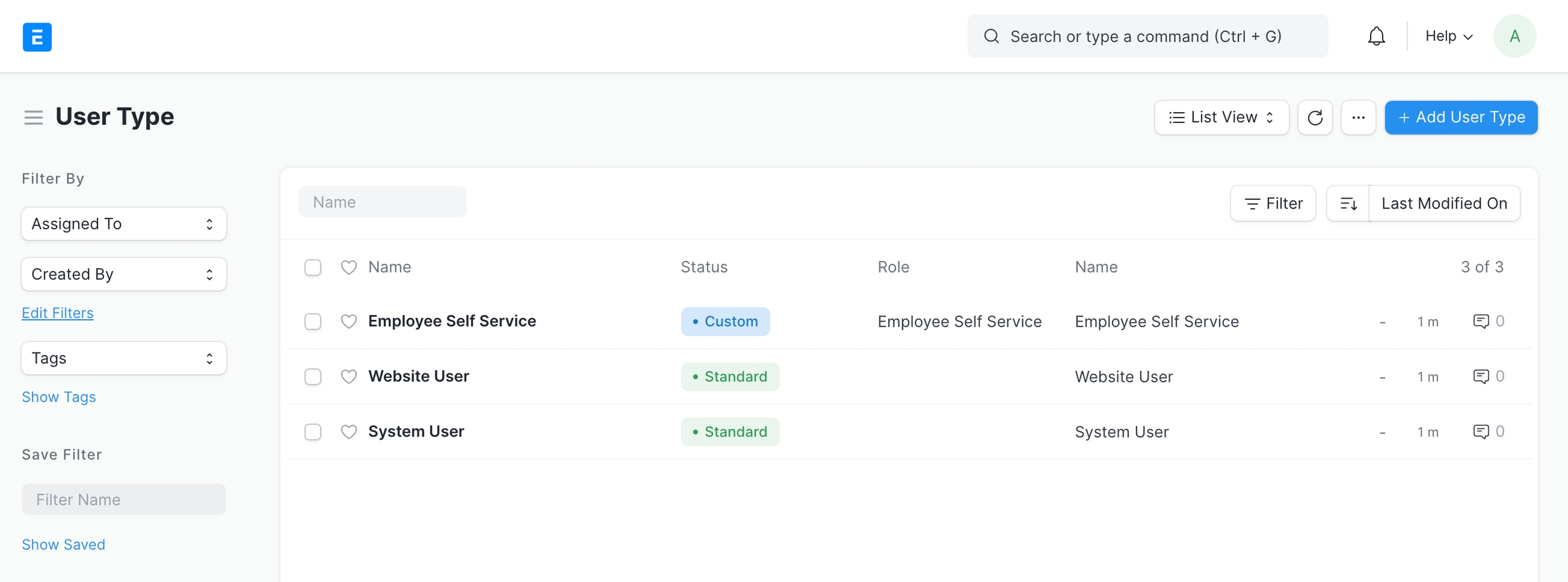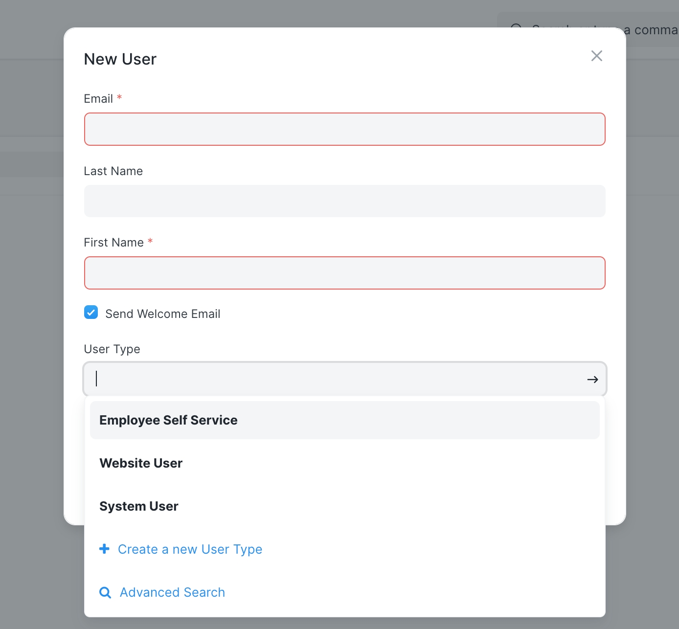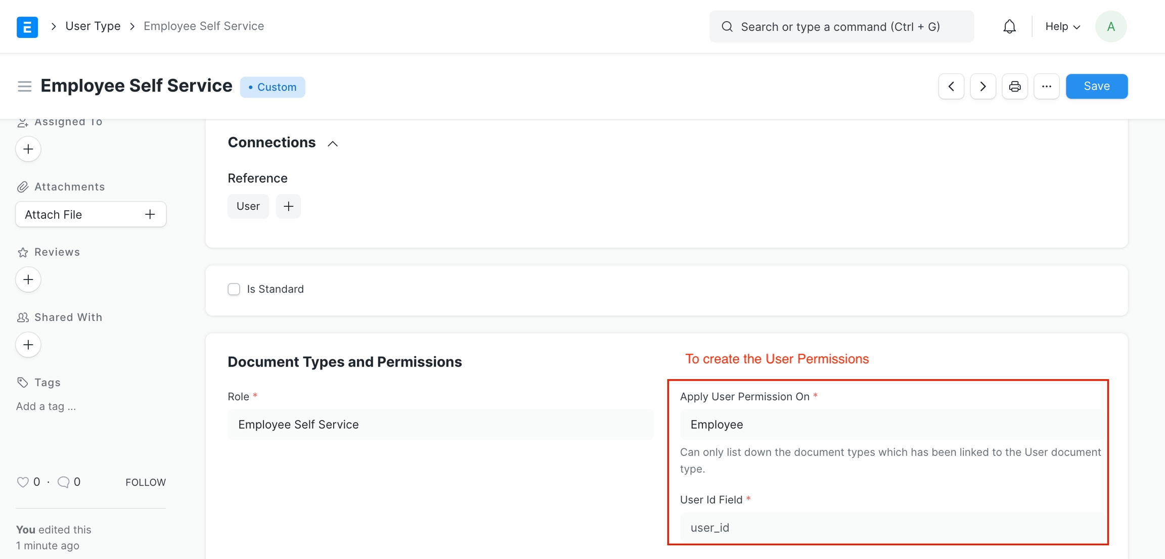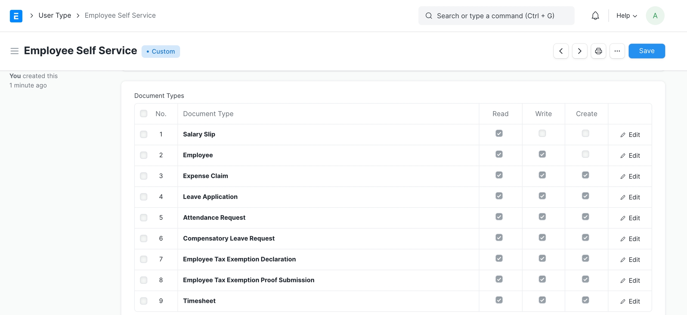 Tài liệu Loại người dùng đóng vai trò quan trọng để xử lý trường hợp sử dụng này. Có các Loại người dùng mặc định, "Người dùng hệ thống" và "Người dùng trang web", Người dùng hệ thống có thể truy cập vào bàn làm việc và cổng trang web trong khi Người dùng trang web chỉ có thể truy cập vào cổng trang web. Để xử lý trường hợp nhân viên bị hạn chế truy cập tài liệu theo mặc định, ERPNext đã thêm loại người dùng mới 'Nhân viên tự phục vụ'.