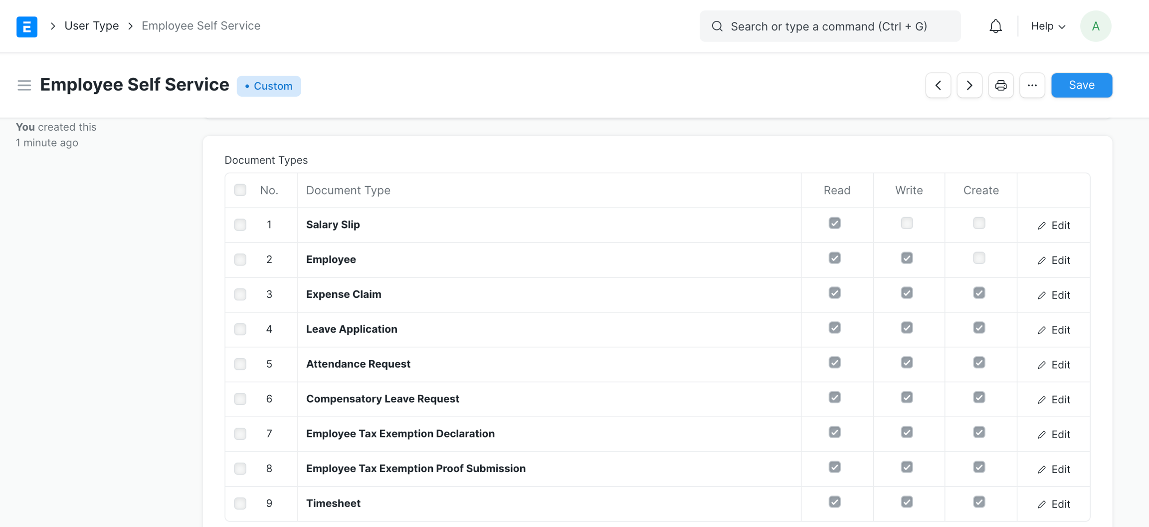 Trong bảng này, bạn cần liệt kê tất cả các loại tài liệu mà bạn muốn Người dùng Tự phục vụ của Nhân viên có quyền truy cập CHỌN. Không có giới hạn về số lượng loại tài liệu bạn có thể thêm vào đây. Người dùng sẽ không thể tạo bản ghi cho các tài liệu mà họ có quyền truy cập Select perm.