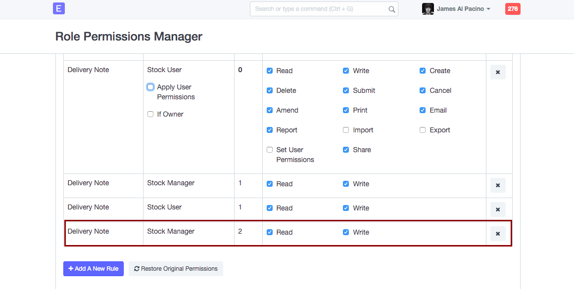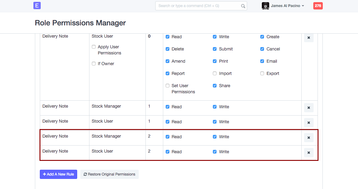Đối với Người quản lý kho hàng, họ sẽ có quyền đối với các trường trên Phiếu giao hàng với Perm cấp 2, trong khi Người dùng kho sẽ không có bất kỳ quyền nào trên Perm cấp 2 đối với Phiếu giao hàng, vì vai trò của họ chưa được chỉ định với quy tắc cho phép họ đọc hoặc viết vào Trường có Cấp độ Perm là 2, như hiển thị bên dưới.
