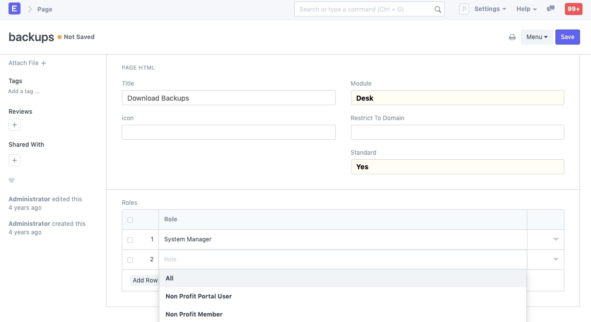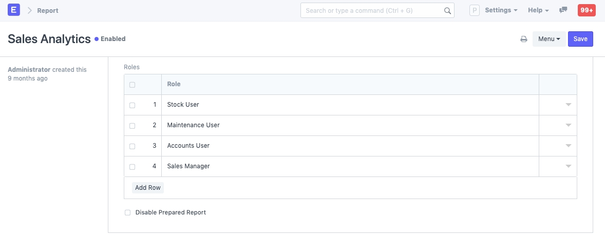 Nếu người dùng đã bật chế độ nhà phát triển thì họ có thể thêm vai trò trực tiếp vào trang và bản ghi báo cáo. Trong trường hợp đó, các quyền cũng sẽ được phản ánh trong tệp JSON cho trang/báo cáo. Hãy xem xét bạn muốn hạn chế các vai trò có thể truy cập các trang và báo cáo nhất định trong ERPNext, điều này có thể được thực hiện thông qua Quyền vai trò cho Trang và Báo cáo.