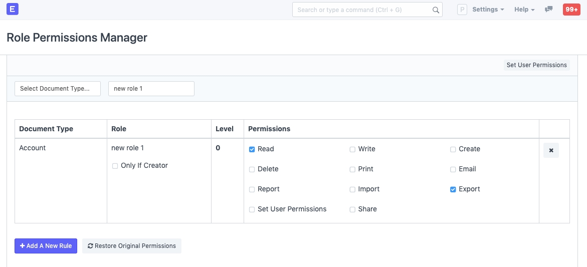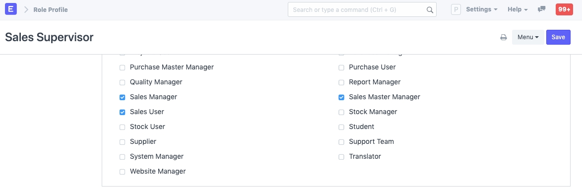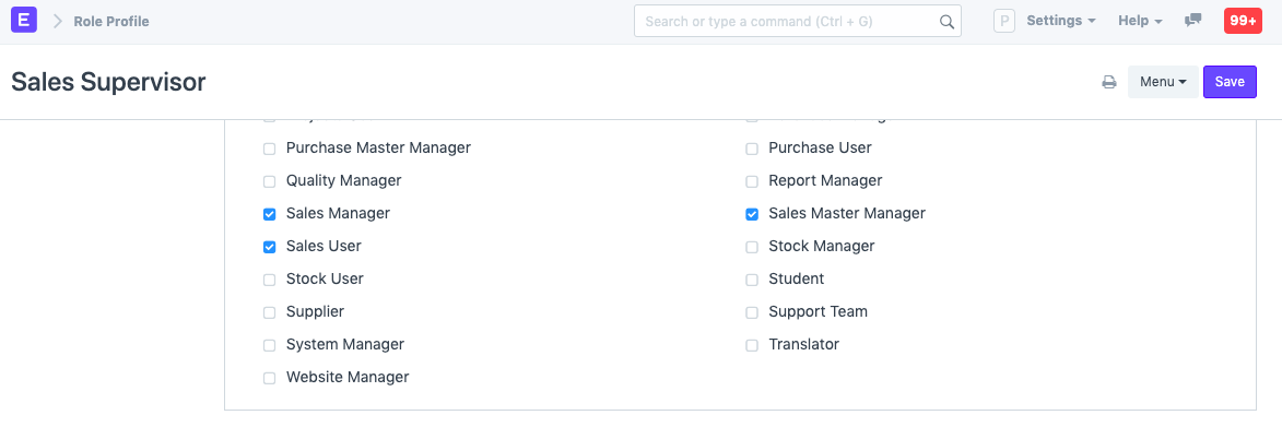 Vai trò xác định một tập hợp các quyền có thể được đặt từ Trình quản lý quyền của vai trò. Các vai trò được sử dụng phổ biến nhất đã được xác định trong ERPNext, bạn có thể sử dụng hệ thống cùng với chúng. Nếu cần, bạn có thể thêm nhiều vai trò hơn. Ví dụ: nếu bạn chỉ định vai trò Người dùng bán hàng cho một người dùng, họ sẽ có thể truy cập các tài liệu như Báo giá và Đơn đặt hàng vì các quyền đã được đặt cho vai trò Người dùng bán hàng.