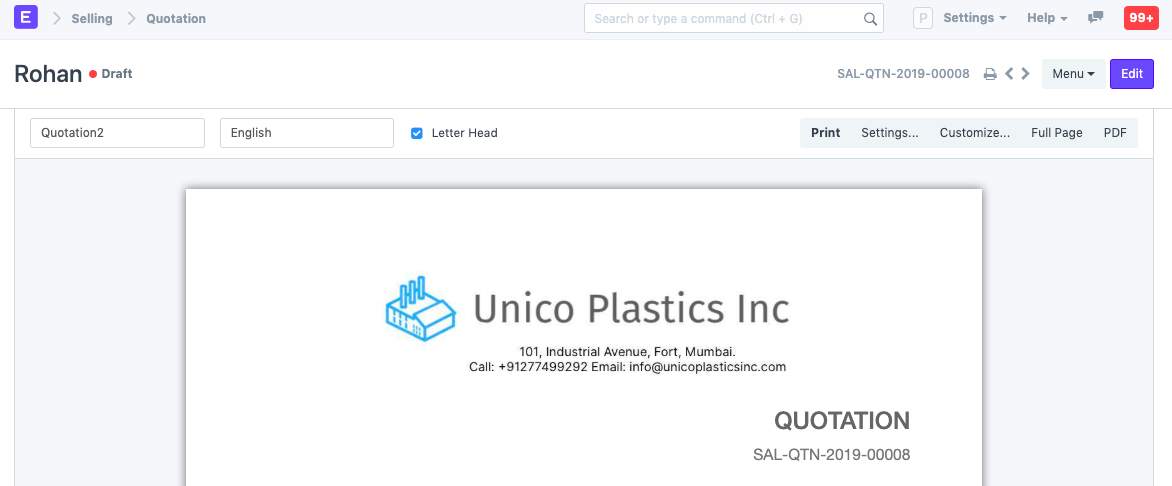 Các chi tiết này sẽ xuất hiện ở Format Print của các giao dịch như Lệnh bán hàng, Hóa đơn bán hàng, Phiếu lương, Lệnh mua hàng, v.v. Trong ERPNext, Letter Head chỉ để thiết lập phần trên cùng của tài liệu, các nội dung khác được định dạng sẵn và có thể được cấu hình thông qua Định dạng in và Tiêu đề in.