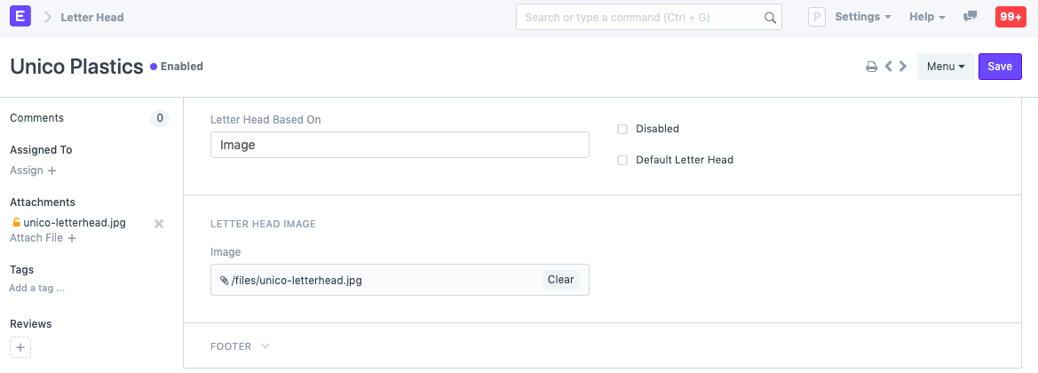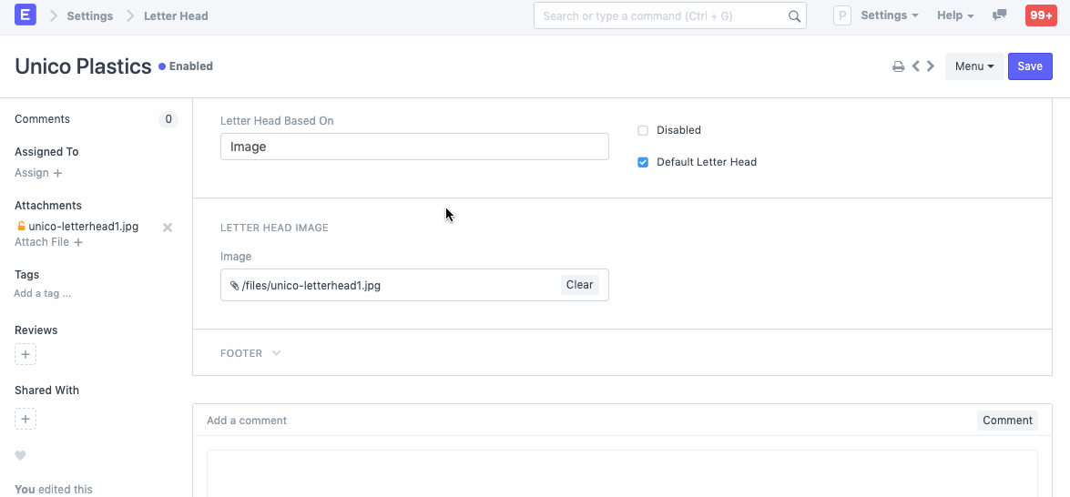 Mỗi công ty đều có một Letter Head mặc định. Các giá trị Letter Head này thường được đặt làm Header và Footer trong tài liệu. Trong ERPNext, bạn có thể nắm bắt những chi tiết này trong phần chính của Tiêu đề thư.