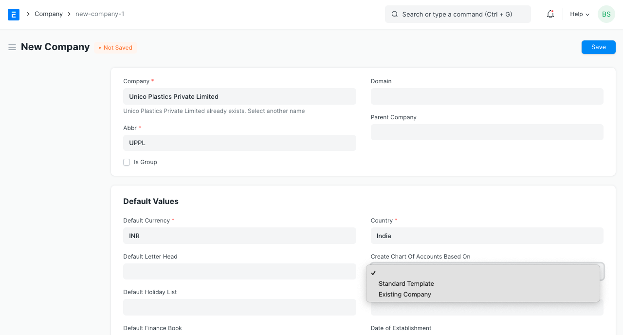 Nhập tên, chữ viết tắt và đơn vị tiền tệ mặc định của công ty.