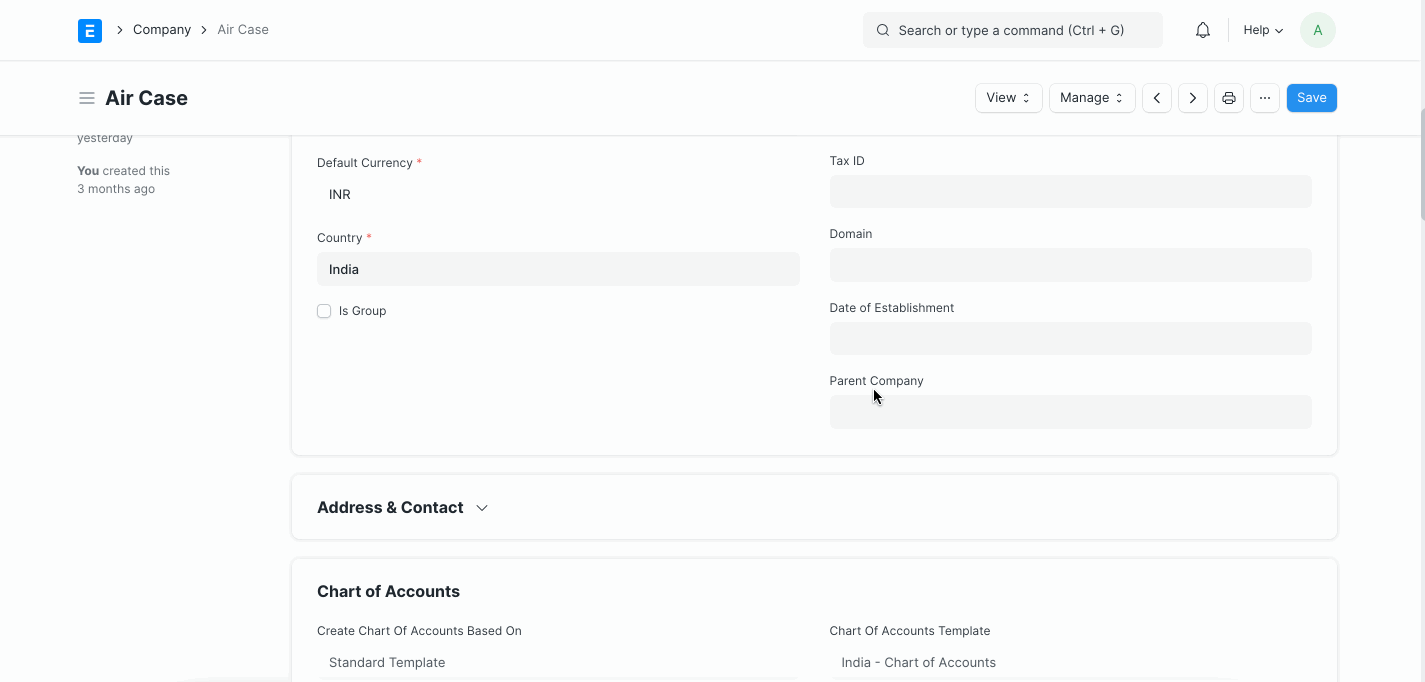 Công ty mẹ: Nếu đây là công ty con, hãy đặt công ty mẹ từ trường này, tức là chọn một nhóm công ty mà công ty này trực thuộc. Nếu công ty mẹ được đặt, Hệ thống tài khoản cho công ty mới mà bạn đang tạo sẽ được tạo dựa trên công ty mẹ đã chọn.